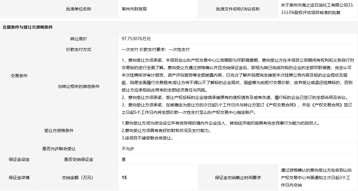 萊州市海之運(yùn)石油化工有限公司33.3333%國有股權(quán)