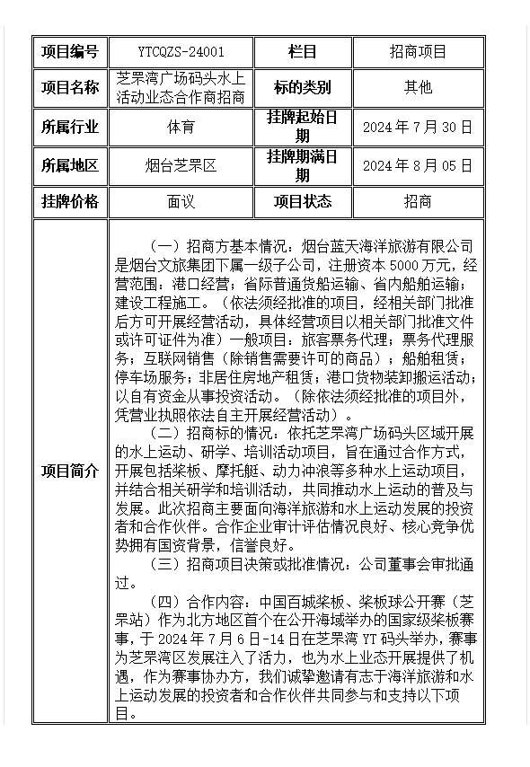 掛牌起止日期:2024年7月30日至2024年8月5日